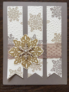 This little guy's black hat is super sparkly thanks to some Black Glimmer Paper! This set comes with it's own set of Snow Friends Framelit Dies, so it's easy to punch out the hat, tie, and arms. Some Striped Ribbon accents his hat and top of the tag. The Curvy Corner Trio Punch and some Washi Tape help add to the mood. Finally, a background of Whisper White Craft Ink snowflakes are stamped and two of my favorite ribbons are used...Real Red 1/4" Cotton Ribbon and the lovely Burlap Ribbon!